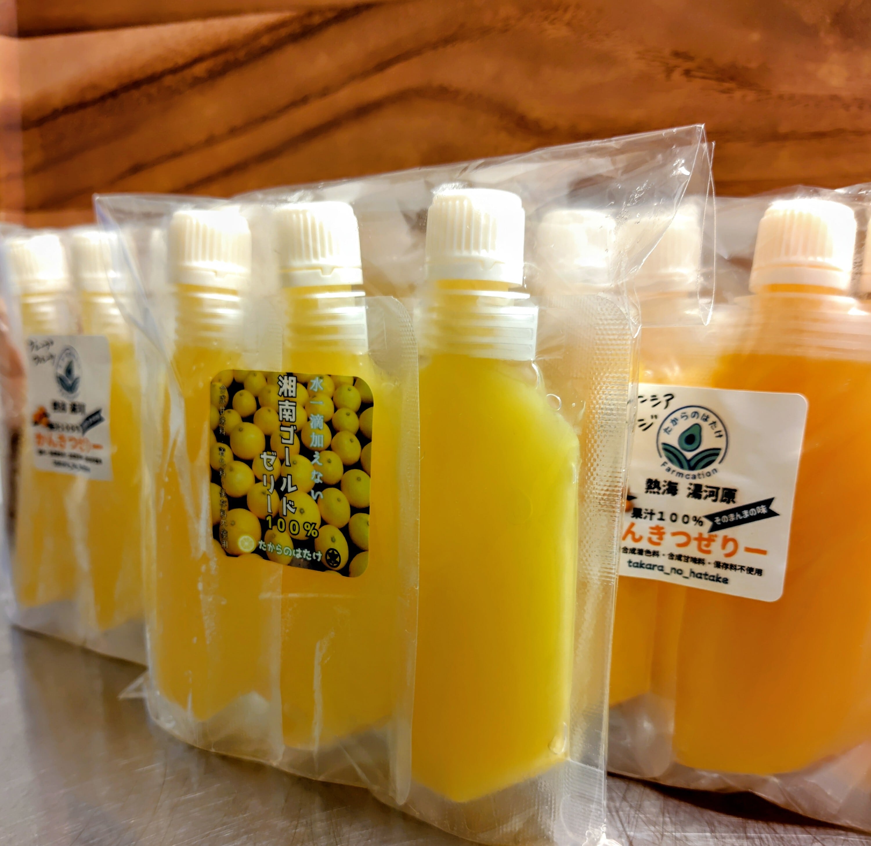 ということで、【!!!猛暑特価!!!】で、たからのはたけの自信作『湘南ゴールドゼリー』と、『ニューサマーオレンジゼリー』、そして夏の柑橘